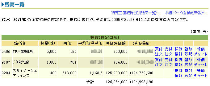 何故こんなことがおこったかというと、3/1 付けで株式 200 分割が行われた後、利用先の証券会社のシステムでの時価評価方法が分割前の値段だったために、表示上 8:30 の画像が出来上がった訳だ。